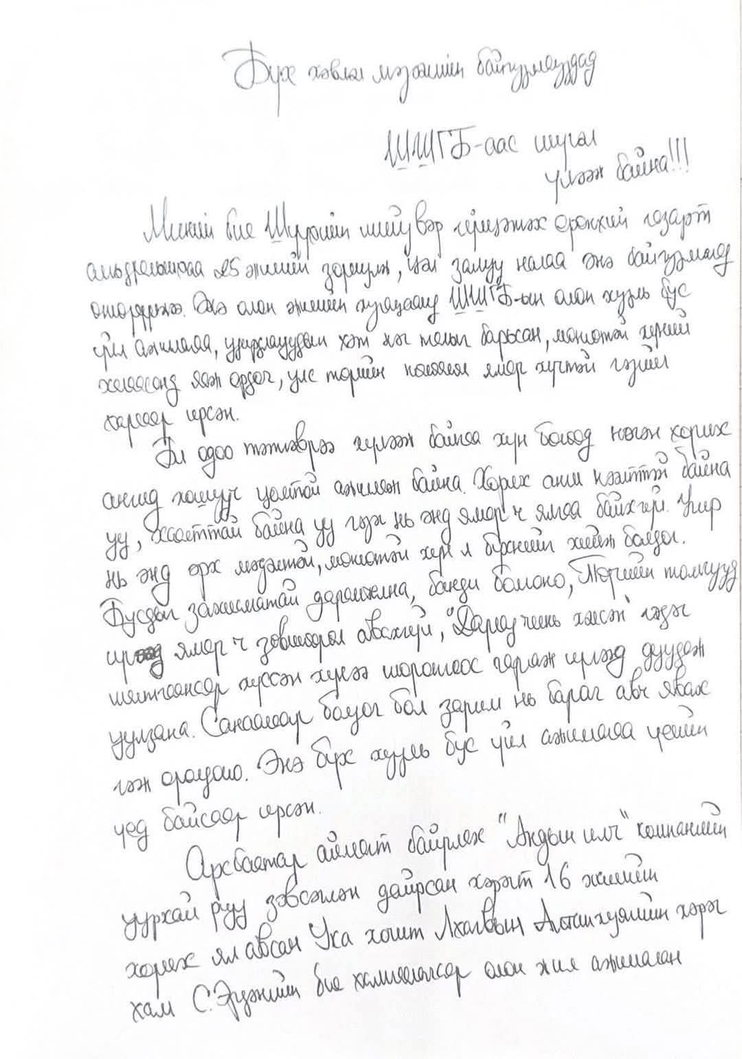 Миний бие Шүүхийн шийдвэр гүйцэтгэх ерөнхий газарт амьдралынхаа 25 жилийг зориулж, цэл залуу насаа энэ байгууллагад өнгөрүүлжээ. Энэ олон жилийн хугацаанд Шүүхийн шийдвэр гүйцэтгэх байгууллагын олон хууль бус үйл ажиллагаа, удирдлагуудын хэт нэг талыг барьсан, мөнгөтэй хүний халаасанд яаж ордог, улс төрийн нөлөөлөл ямар хүчтэй гэдгийг харсаар ирсэн.