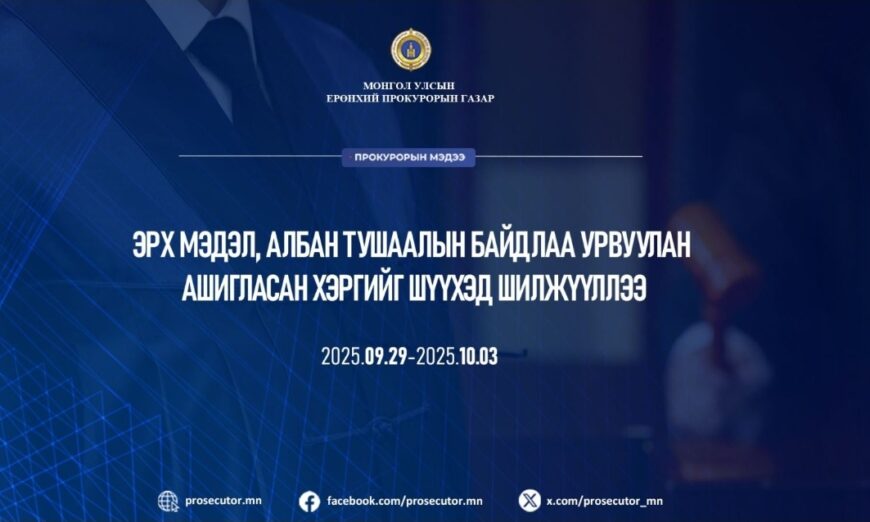 Прокурорын байгууллага 2025 оны 9 дүгээр сарын 29-ний өдрөөс 10 дугаар сарын 03-ны өдрийг хүртэлх хугацаанд хэрэг бүртгэлт, мөрдөн байцаалтын 55,088 эрүүгийн хэрэгт хяналт тавин ажиллажээ.