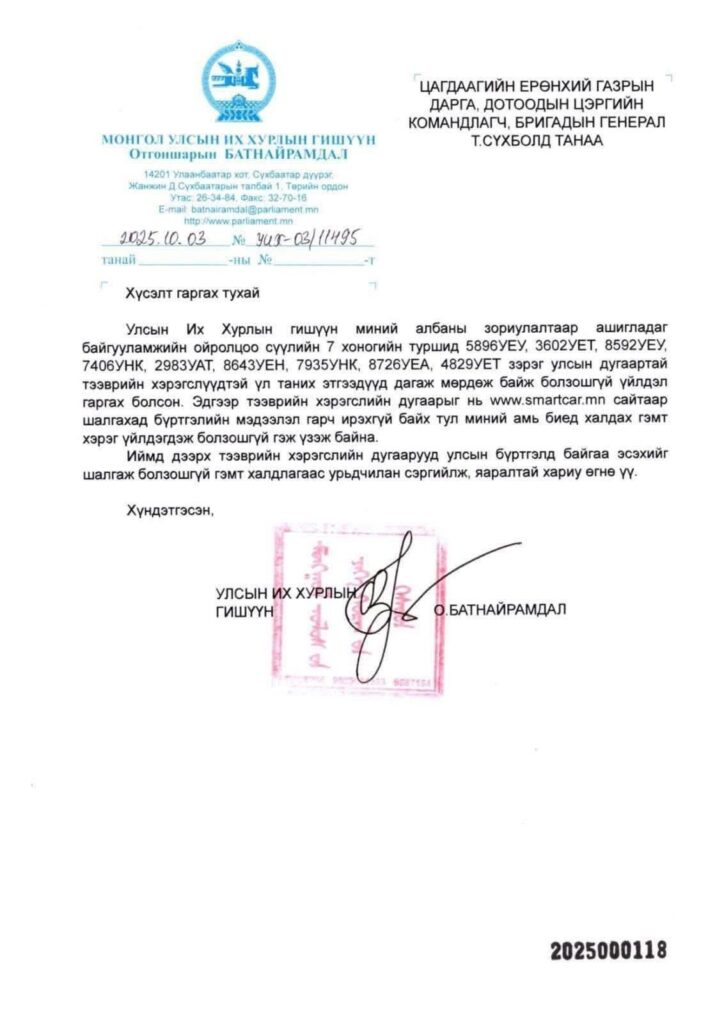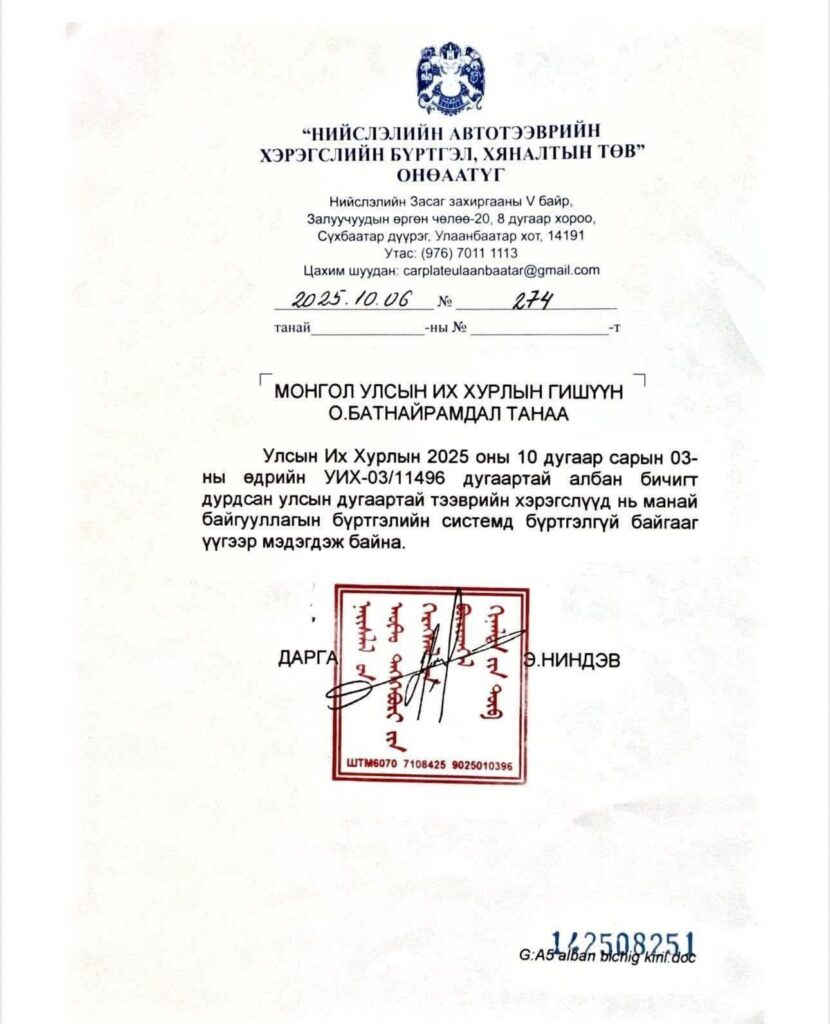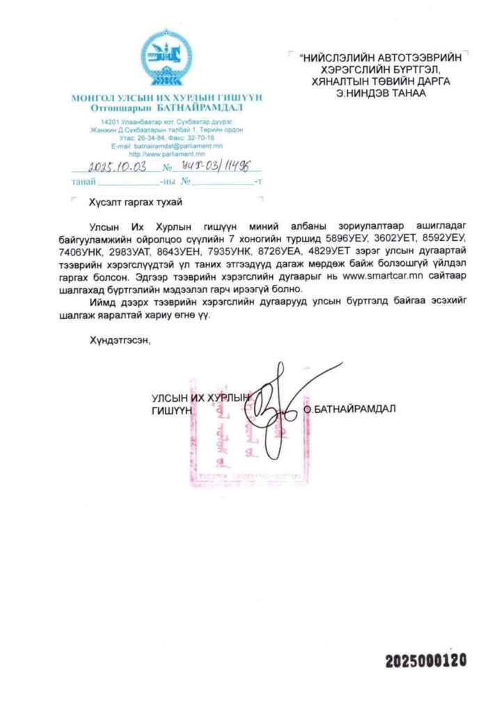 Улмаар нийслэлийн Авто тээврийн хяналтын төвөөс эдгээр бүх машинууд нь улсын БҮРТГЭЛГҮЙ болохыг баталгаажуулж хариу ирүүлсэн нь хянан шалгах үйл ажиллагааг мөрдөн мөшгөж буй үйл ажиллагаа гэж бид ойлгож байна.