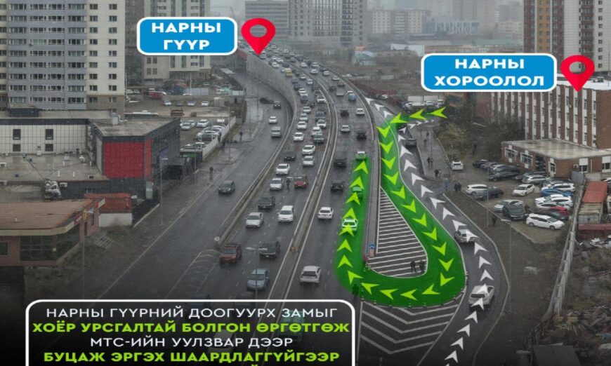 Нарны гүүрний зүүн талын нэг эгнээ замыг өргөтгөх ажил дууссан бөгөөд  маргааш буюу 10-р сарын 15-наас нээнэ. Үүнтэй холбоотойгоор “Нарны хороолол” талаас ирэх жолооч нар МТС-ийн уулзвараар буцаж эргэх шаардлагагүй шууд Нарны гүүрний зүүн талаар буцаж эргэх эргэлт хийн хотын төв рүү шууд орох боломжтой.