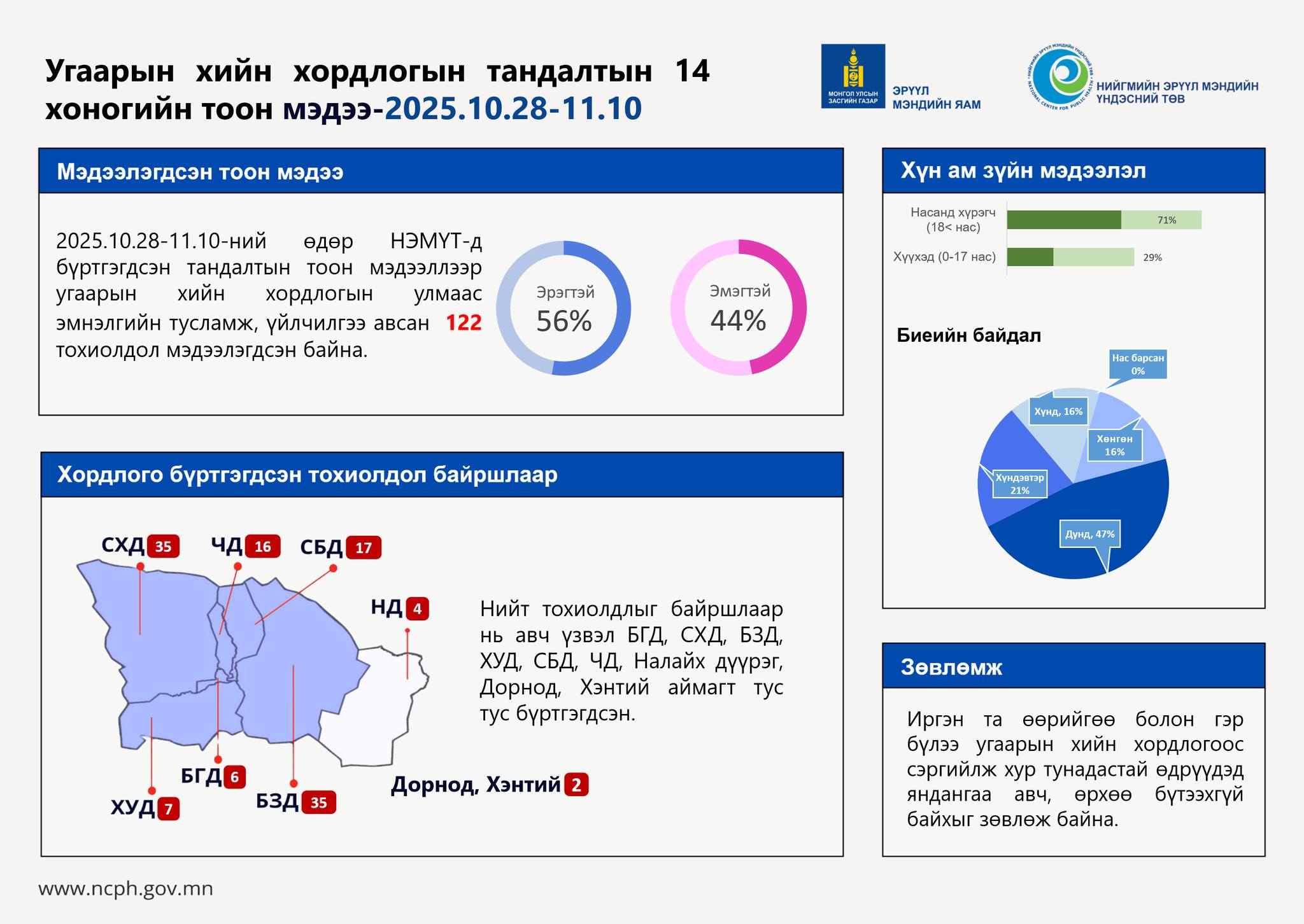 НЭМҮТ угаарын хийн хордлогын тандалтын 14 хоногийн тоон мэдээ танилцуулсан байна ./2025.10.28-11.10 / 14 хоногийн хугацаанд 122 хүн угаарын хийд өртсөн.