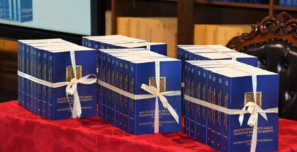 Номын дээжээс Үндэсний номын сан, ШУА-ийн Түүх, угсаатны зүйн хүрээлэн, ШУА-ийн Археологийн хүрээлэн, Парламентын номын сан, Үндэсний статистикийн хороо, Архивын ерөнхий газар болон академич, эрдэмтдийн төлөөлөлд гардуулан өглөө.