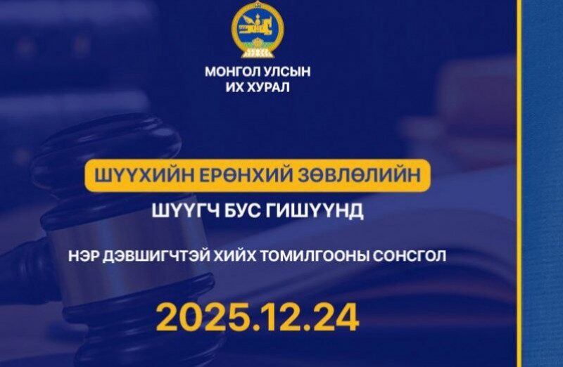 Хууль зүйн байнгын хорооны 2025 оны 12 дугаар сарын 09-ний өдрийн хуралдаанаар Шүүхийн ерөнхий зөвлөлийн шүүгч бус гишүүнд нэр дэвшигч 4 иргэнтэй хийх “ТОМИЛГООНЫ СОНСГОЛ”-ыг 2025 оны 12 дугаар сарын 24-ний өдөр зохион байгуулахаар тогтлоо.