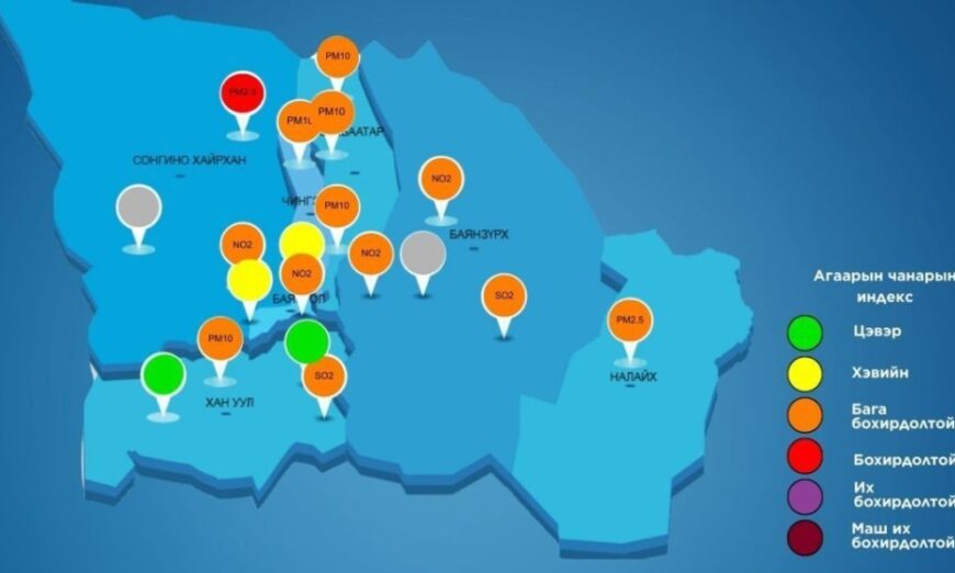 Нийслэлийн агаарын чанарын хяналтын цэгүүдээс ирүүлсэн мэдээллээр Баянхошуу, 5-н буудал болон Зурагт орчимд агаар маш их бохирдолтой байна.