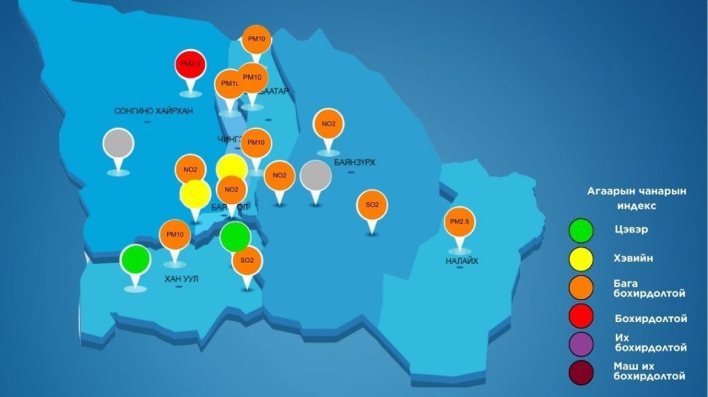 Хүхэрлэг хий (SO2) нь 36-125 мкг/м3, хамгийн өндөр агууламж илэрсэн цэг Баянхошуу орчим 125 мкг/м3 буюу АЧС-аас 2.5 дахин их