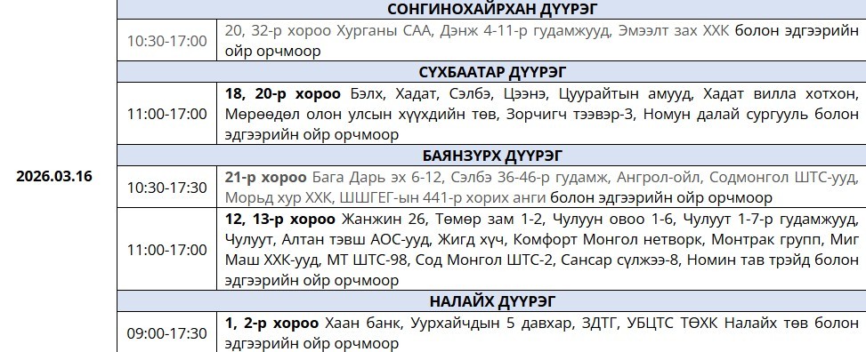 Цахилгаан шугам тоноглолд засвар үйлчилгээ хийхийн тулд цахилгаан хязгаарладаг. Энэ сард аль дүүрэгт хэзээ цахилгаан таслах хуваарийг Улаанбаатар цахилгаан түгээх сүлжээнээс танилцуулав.