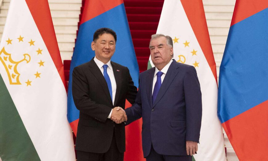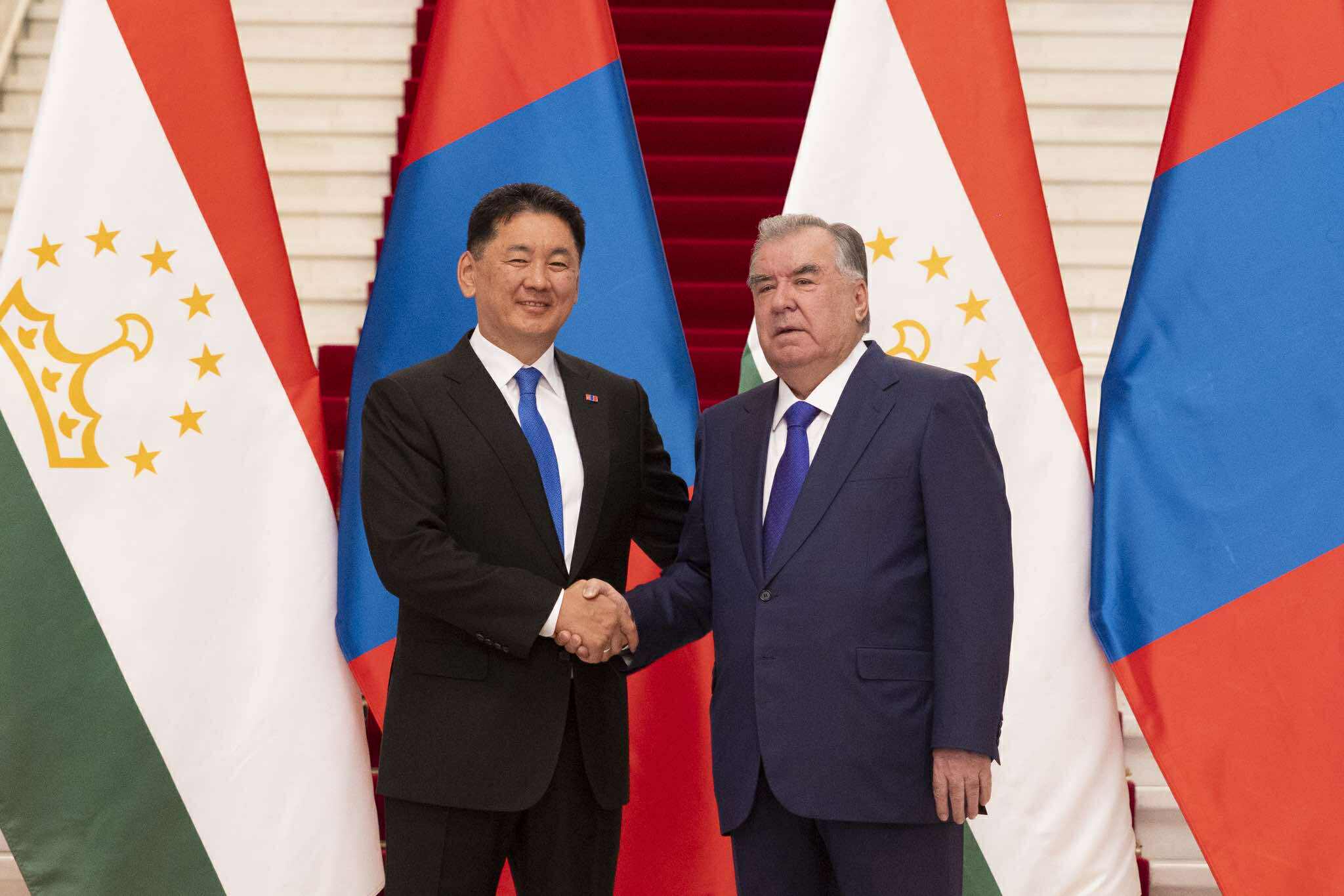Ерөнхийлөгч Эмомали Рахмон, хоёр улсын хооронд 1992 онд дипломат харилцаа тогтоосноос хойш анх удаа төрийн айлчлал хийж байгаад Ерөнхийлөгч У.Хүрэлсүхэд баяр хүргэлээ.