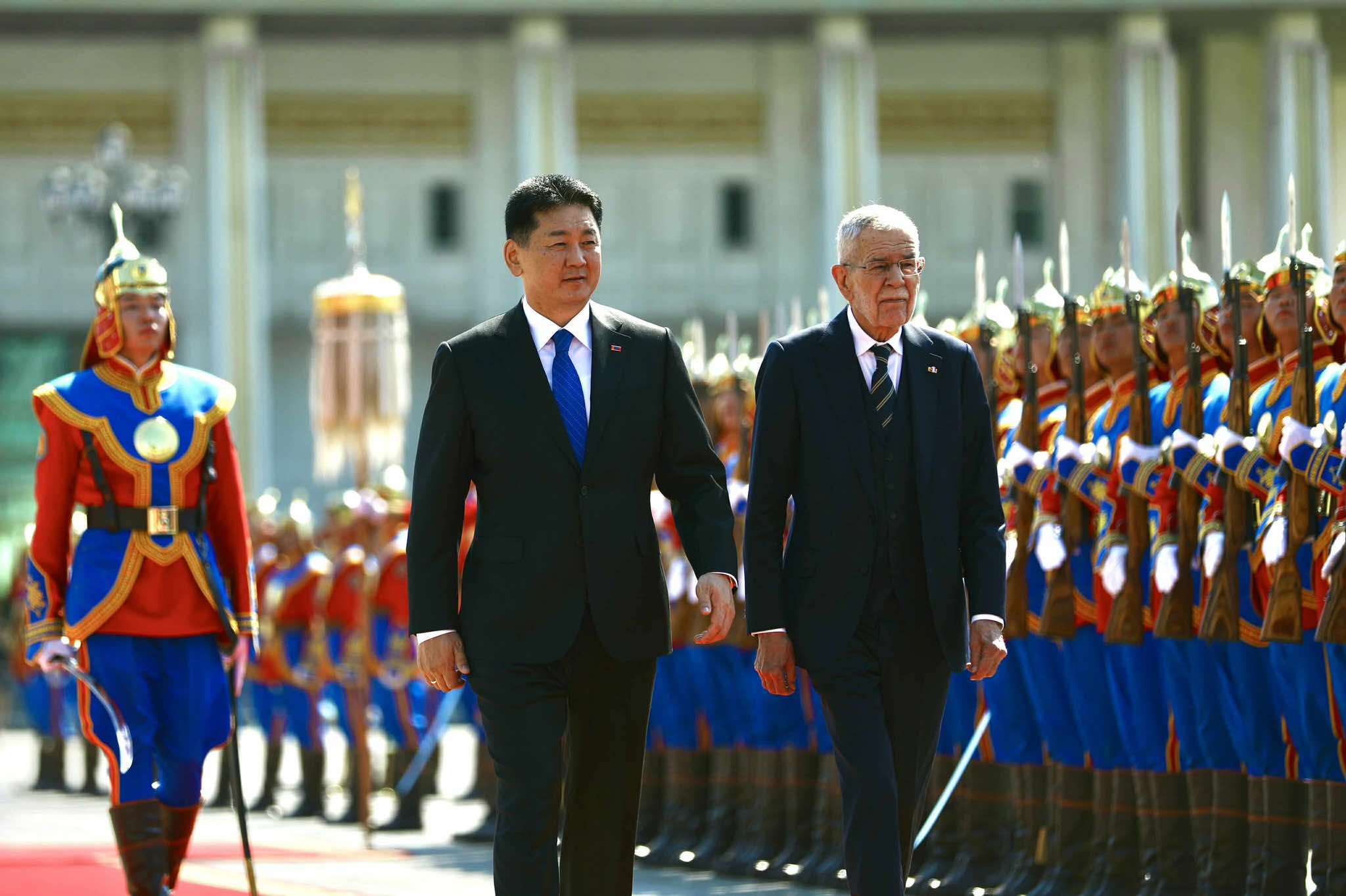 Монгол Улсын Ерөнхийлөгч Ухнаагийн Хүрэлсүх, гэргий Лувсандоржийн Болорцэцэгийн хамт Бүгд Найрамдах Австри Улсын Ерөнхийлөгч Александр Ван дер Беллен, гэргий Дорис Шмидауэр нарыг Д.Сүхбаатарын талбайд угтаж авлаа.
