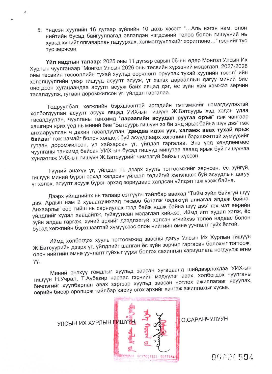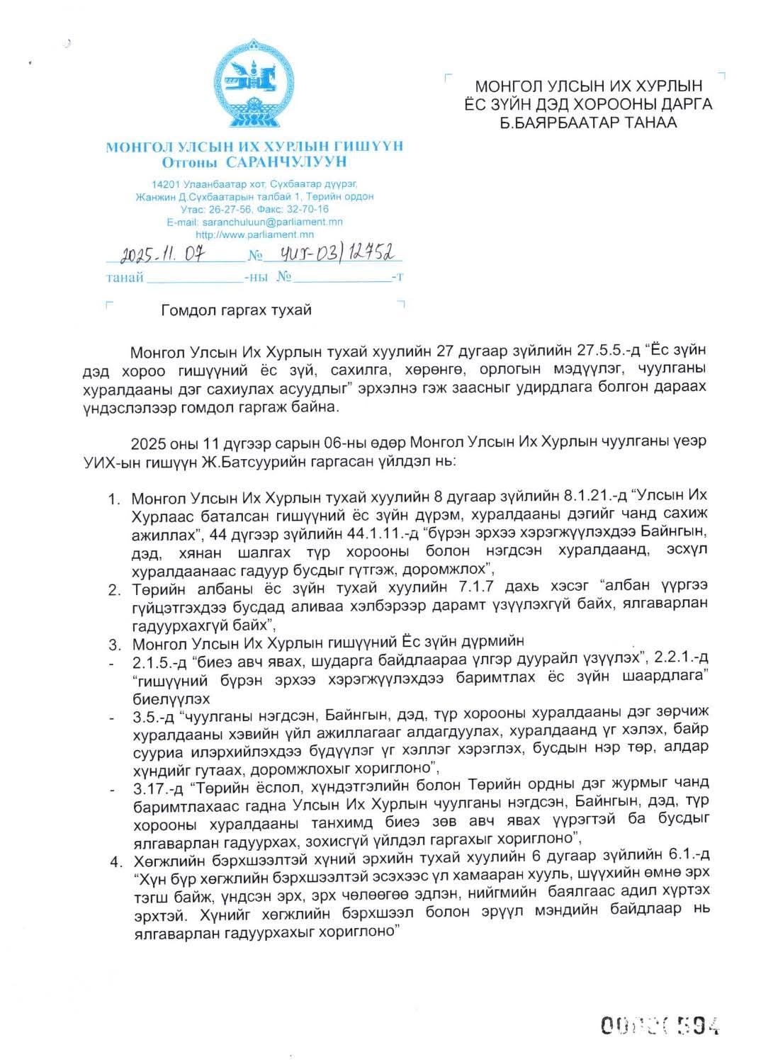 УИХ-ын гишүүн О.Саранчулуун УИХ-ын гишүүн, сайд асан Ж.Батсуурийн 11-р сарын 07-ны өдрийн чуулганаар гаргасан үйлдэл нь хэд хэдэн хууль, зохицуулагдах хэм хэмжээг зөрчсөн тул албан ёсоор Ёс зүйн хороонд хандсан байна.