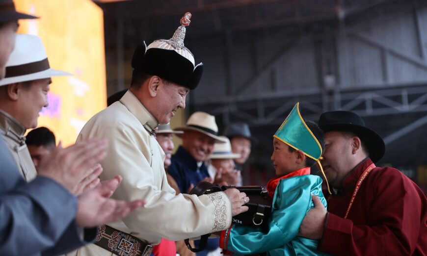 Монгол Улсын Ерөнхийлөгч хурдан морины унаач хүүхдүүдэд баяр хүргэж бэлэг гардуулав