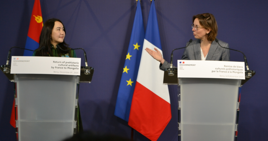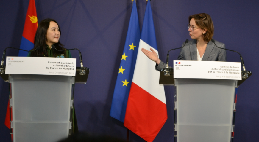 Бүгд Найрамдах Франц Улсын хууль сахиулах байгууллагаас 2013, 2015 онд хураасан үлэг гүрвэлийн чулуужсан олдворыг Монгол Улсад үнэ төлбөргүй хүлээлцэх актад гарын үсэг зурах ёслолын арга хэмжээ 2025 оны 12 дугаар сарын 08-ны өдөр Парис хотноо зохион байгуулагдлаа. Гарын үсэг зурах ёслолд Монгол Улсын Соёл, спорт, аялал жуулчлал, залуучуудын сайд Ч.Ундрам, Бүгд Найрамдах Франц Улсын Төрийн сан, үйл ажиллагааны сайд Амели де Мончалин болон хоёр талын албаны хүмүүс оролцлоо.