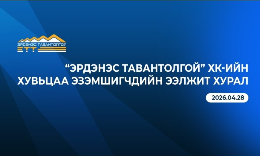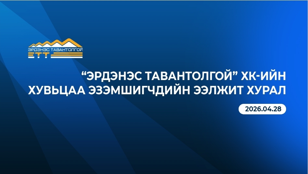“Эрдэнэс Тавантолгой” ХК-ийн Хувьцаа эзэмшигчдийн ээлжит хурал 2026 оны 04 дүгээр сарын 28-ны өдрийн 09.00 цагт Улаанбаатар хот, Сүхбаатар дүүргийн 8 дугаар хороо, Галлериа төвийн 3 дугаар давхарын “Жуулчин Гранд Баллрүүм” хурлын танхимд хуралдана.