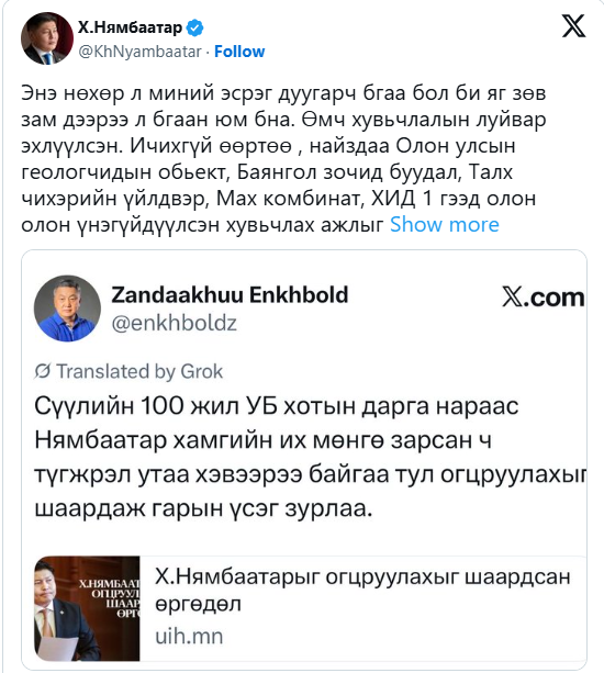 UIH.mn дээр Х.Нямбаатарыг Хотын даргаас “огцруулах” өргөдлийг иргэд санаачлан гарын үсэг цуглуулж эхэлсэн. УИХ-ын дарга асан З.Энхболд дээрх өргөдөлд гарын үсгээ зурсан талаараа цахим хуудаснаа мэдэгджээ.