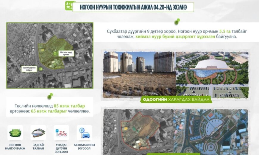 Сүхбаатар дүүргийн 9 дүгээр хороо, Ногоон нуур орчмын 5.5 га талбайг чөлөөлж, хиймэл нуур бүхий цэцэрлэгт хүрээлэн олон нийтийн үйл ажиллагаа явуулах задгай талбай, тоглоомын талбай, явган болон дугуйн зам, авто зам, авто зогсоол байгуулж, тохижуулах ажил энэ сарын 20-нд эхэлнэ.